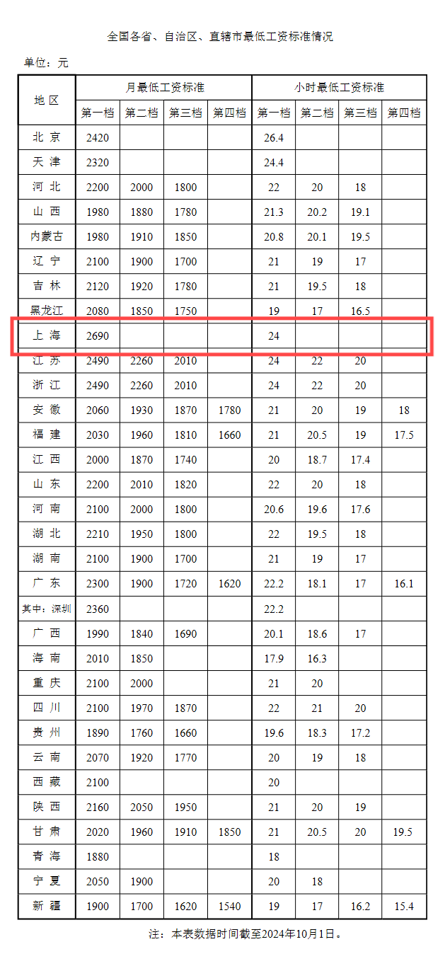 上海目前执行的最低工资标准只有一档,月薪为2690元/月,非全日制职工最低小时工资标准为24元/时。
