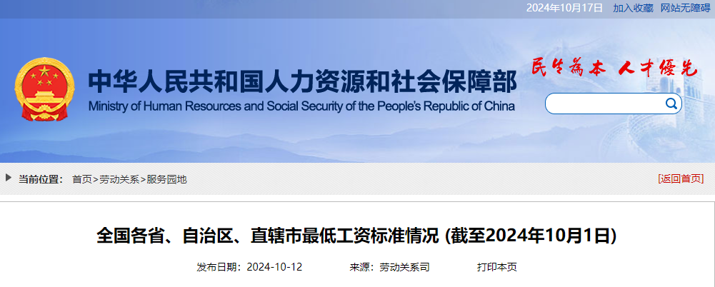 人社部官网发布了全国各省、自治区、直辖市最低工资标准情况。